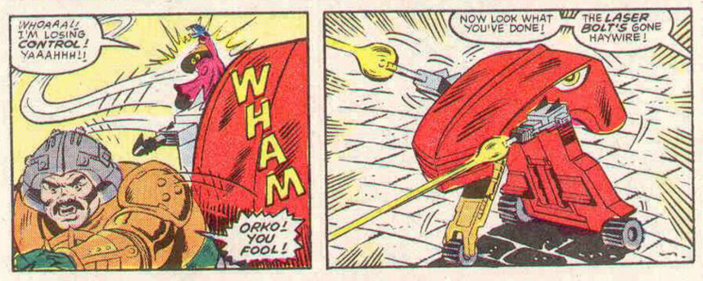 In issue #2, Orko screws around and causes the Laser Bolt (one of my personal favorite He-Man vehicles) to go haywire, which shoots a meteor out of the sky. Adam, Cringer, and Orko investigate, encountering the Evil Meteorbs for the first time.